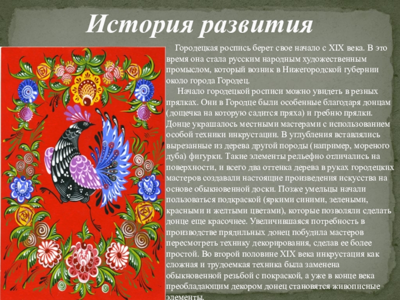 В это время она стала русским народным художественным промыслом, который возник в Нижегородской губернии около города Городец.