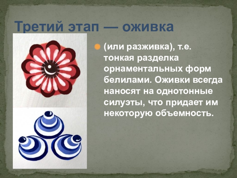 (или разживка), т.е. тонкая разделка орнаментальных форм белилами.