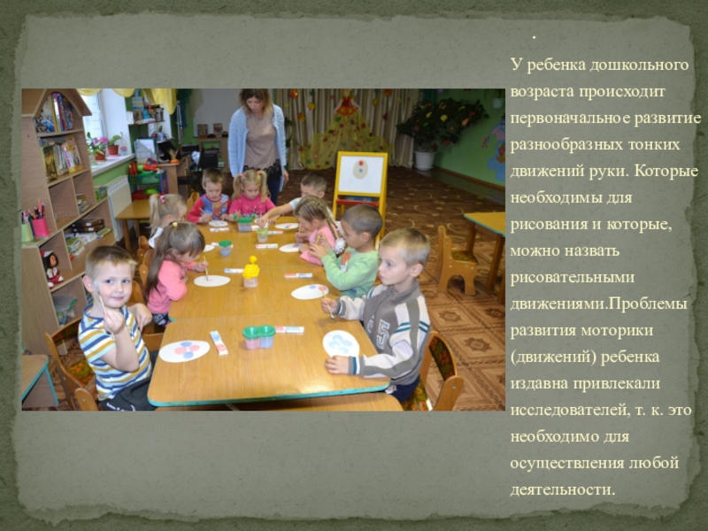 Слайд 15У ребенка дошкольного возраста происходит первоначальное развитие разнообразных тонких движений руки.