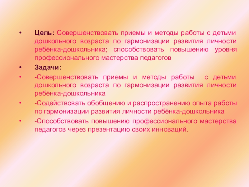 -Совершенствовать приемы и методы работы с детьми дошкольного возраста по гармонизации развития личности ребёнка-дошкольника