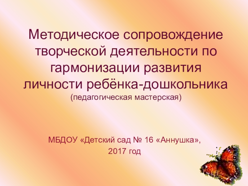 Слайд 2Методическое сопровождение творческой деятельности по гармонизации развития личности ребёнка-дошкольника (педагогическая мастерская)