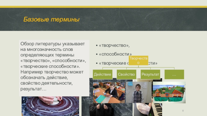 Обзор литературы указывает на многозначность слов определяющих термины «творчество», «способности», «творческие способности». Например творчество может обозначать действие, свойство деятельности, результат…