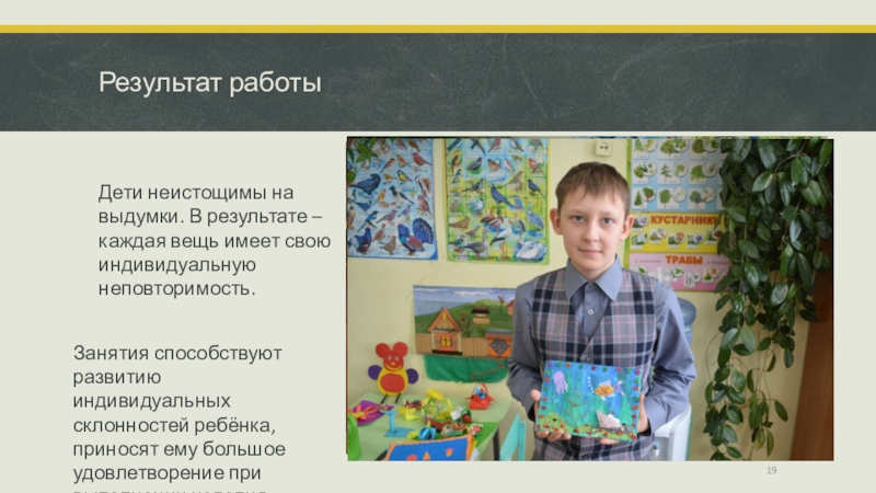 Занятия способствуют развитию индивидуальных склонностей ребёнка, приносят ему большое удовлетворение при выполнении изделия.