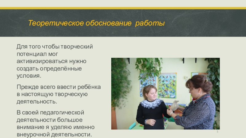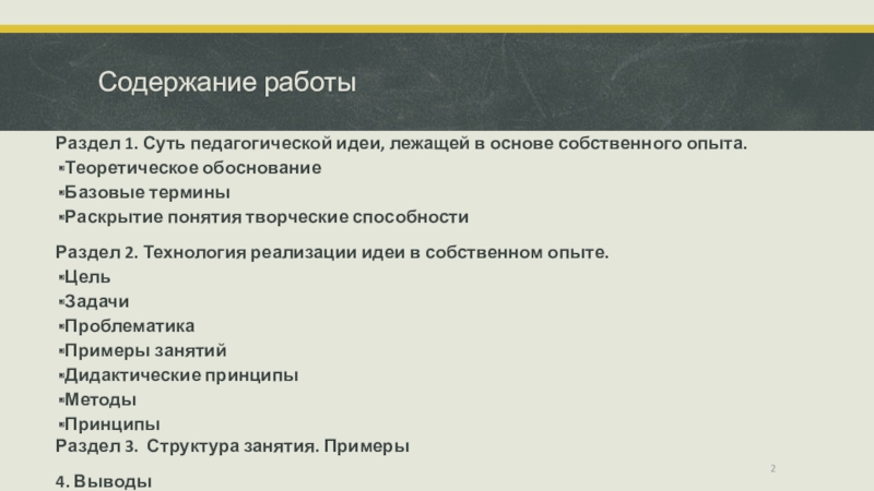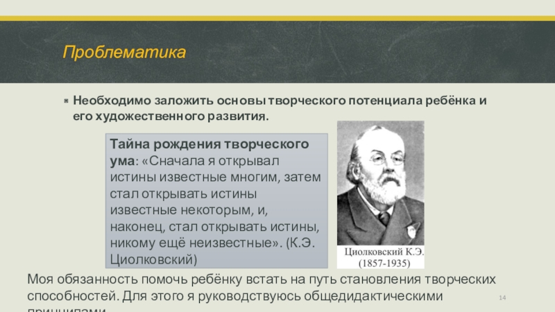 Моя обязанность помочь ребёнку встать на путь становления творческих способностей. Для этого я руководствуюсь общедидактическими принципами.