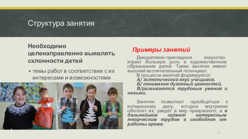 Занятия позволяют приобщиться к интересному делу, которое внутренне обогатит их, уведёт в мир прекрасного, а в дальнейшем займет интересным творческим трудом в свободное от работы время.