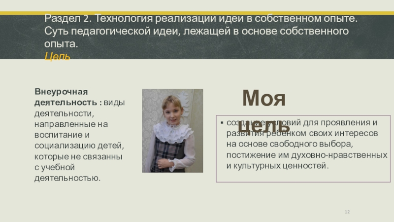создание условий для проявления и развития ребёнком своих интересов на основе свободного выбора, постижение им духовно-нравственных и культурных ценностей.