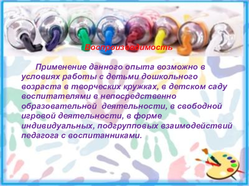 Применение данного опыта возможно в условиях работы с детьми дошкольного возраста в творческих кружках, в детском саду воспитателями в непосредственно образовательной деятельности, в свободной игровой деятельности, в форме индивидуальных, подгрупповых взаимодействий педагога с воспитанниками.