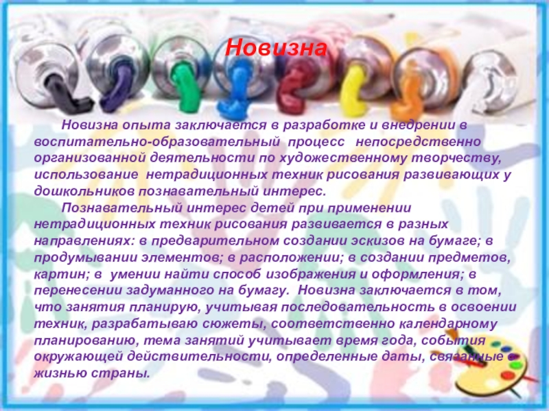 Познавательный интерес детей при применении нетрадиционных техник рисования развивается в разных направлениях: в предварительном создании эскизов на бумаге; в продумывании элементов; в расположении; в создании предметов, картин; в умении найти способ изображения и оформления; в перенесении задуманного на бумагу. Новизна заключается в том, что занятия планирую, учитывая последовательность в освоении техник, разрабатываю сюжеты, соответственно календарному планированию, тема занятий учитывает время года, события окружающей действительности, определенные даты, связанные с жизнью страны.