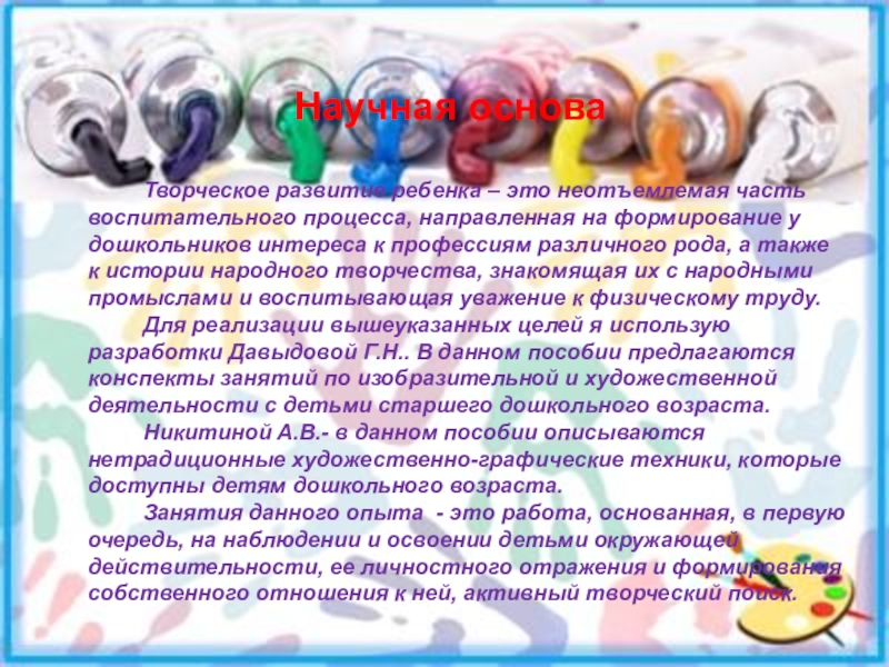 Никитиной А.В.- в данном пособии описываются нетрадиционные художественно-графические техники, которые доступны детям дошкольного возраста.