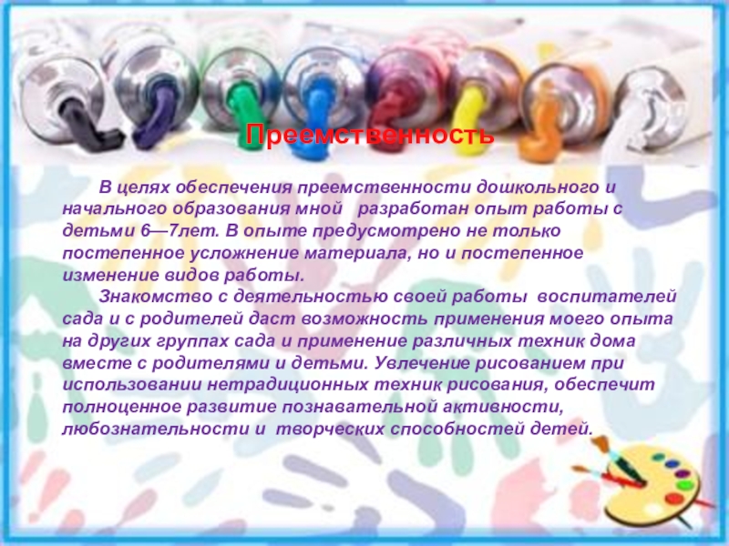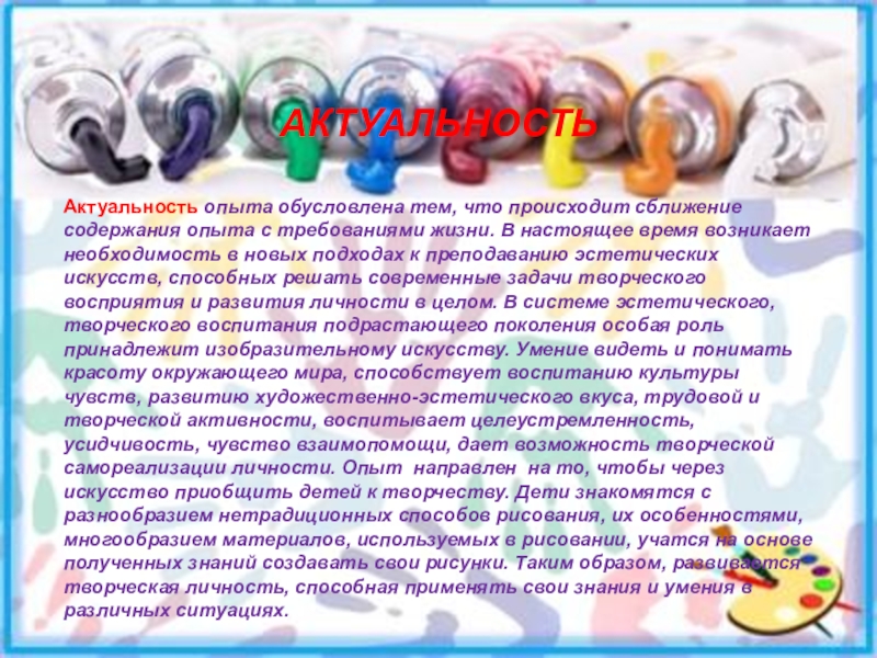 жизни. В настоящее время возникает необходимость в новых подходах к преподаванию эстетических искусств, способных решать современные задачи творческого восприятия и развития личности в целом. В системе эстетического, творческого воспитания подрастающего поколения особая роль принадлежит изобразительному искусству. Умение видеть и понимать красоту окружающего мира, способствует воспитанию культуры чувств, развитию художественно-эстетического вкуса, трудовой и творческой активности, воспитывает целеустремленность, усидчивость, чувство взаимопомощи, дает возможность творческой самореализации личности. Опыт направлен на то, чтобы через искусство приобщить детей к творчеству. Дети знакомятся с разнообразием нетрадиционных способов рисования, их особенностями, многообразием материалов, используемых в рисовании, учатся на основе полученных знаний создавать свои рисунки. Таким образом, развивается творческая личность, способная применять свои знания и умения в различных ситуациях.