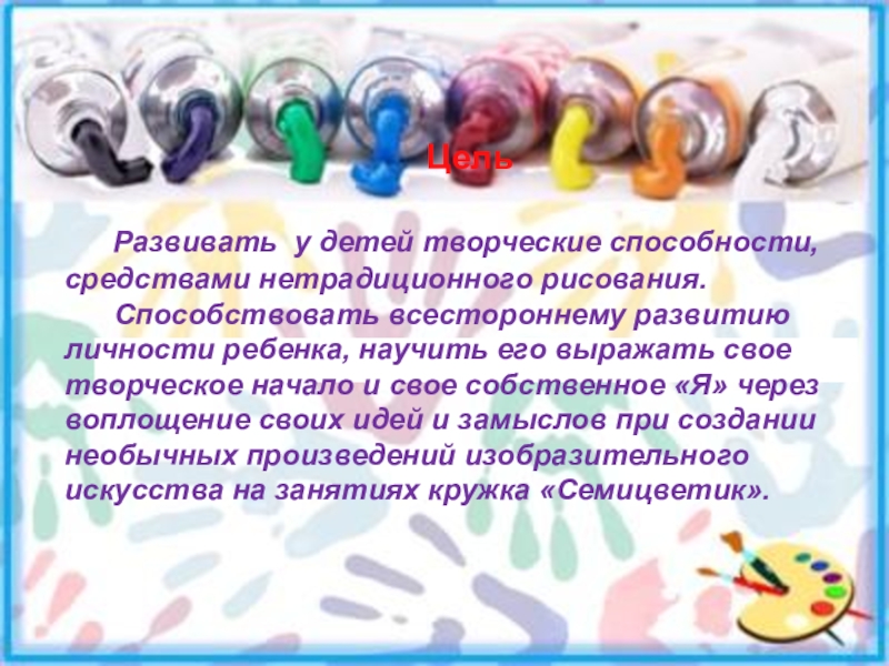 Способствовать всестороннему развитию личности ребенка, научить его выражать свое творческое начало и свое собственное «Я» через воплощение своих идей и замыслов при создании необычных произведений изобразительного искусства на занятиях кружка «Семицветик».