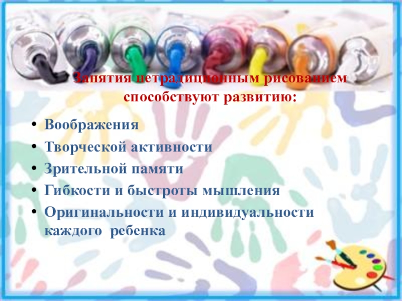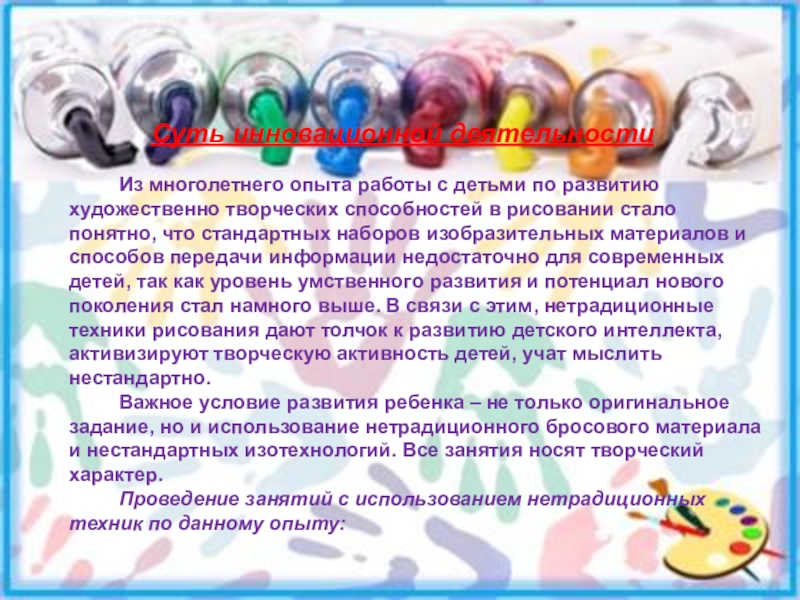 творческих способностей в рисовании стало понятно, что стандартных наборов изобразительных материалов и способов передачи информации недостаточно для современных детей, так как уровень умственного развития и потенциал нового поколения стал намного выше. В связи с этим, нетрадиционные техники рисования дают толчок к развитию детского интеллекта, активизируют творческую активность детей, учат мыслить нестандартно.