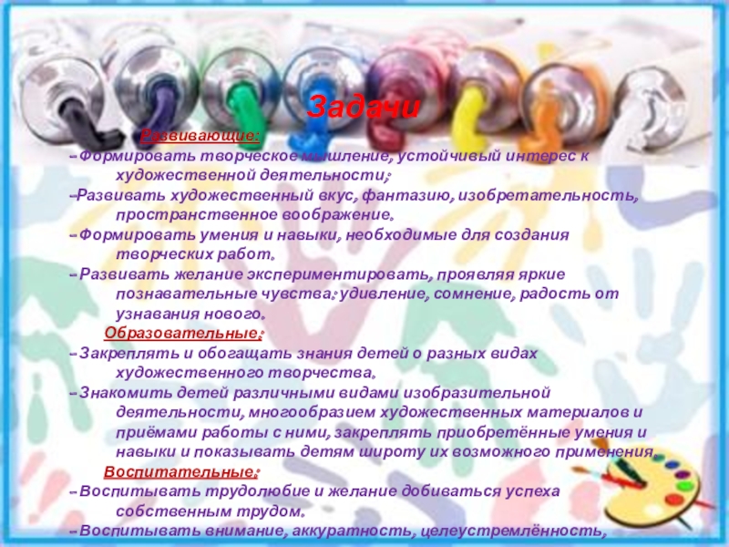 - Знакомить детей различными видами изобразительной деятельности, многообразием художественных материалов и приёмами работы с ними, закреплять приобретённые умения и навыки и показывать детям широту их возможного применения.