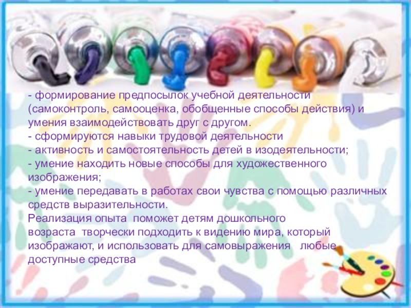 Реализация опыта поможет детям дошкольного возраста творчески подходить к видению мира, который изображают, и использовать для самовыражения любые доступные средства
