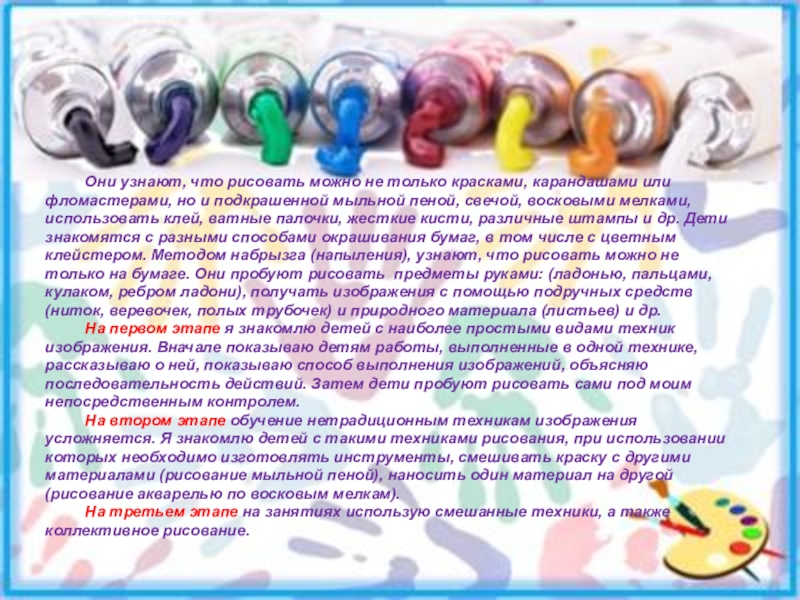 Слайд 11 Они узнают, что рисовать можно не только красками, карандашами или фломастерами,