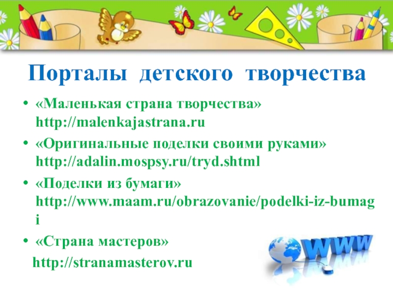 Это сайт презентаций, где можно хранить и обмениваться своими презентациями, докладами, проектами, шаблонами в формате PowerPoint с другими пользователями. Мы помогаем школьникам, студентам, учителям, преподавателям хранить и обмениваться учебными материалами.