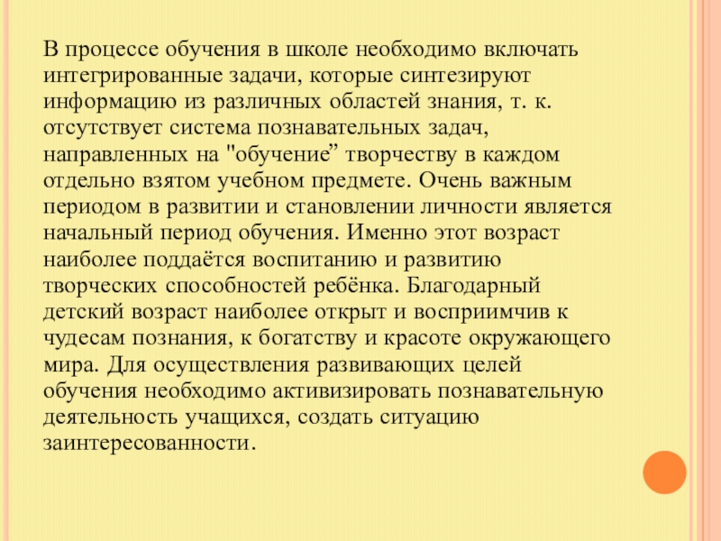 информацию из различных областей знания, т. к. отсутствует система познавательных задач, направленных на "обучение” творчеству в каждом отдельно взятом учебном предмете. Очень важным периодом в развитии и становлении личности является начальный период обучения. Именно этот возраст наиболее поддаётся воспитанию и развитию творческих способностей ребёнка. Благодарный детский возраст наиболее открыт и восприимчив к чудесам познания, к богатству и красоте окружающего мира. Для осуществления развивающих целей обучения необходимо активизировать познавательную деятельность учащихся, создать ситуацию заинтересованности.