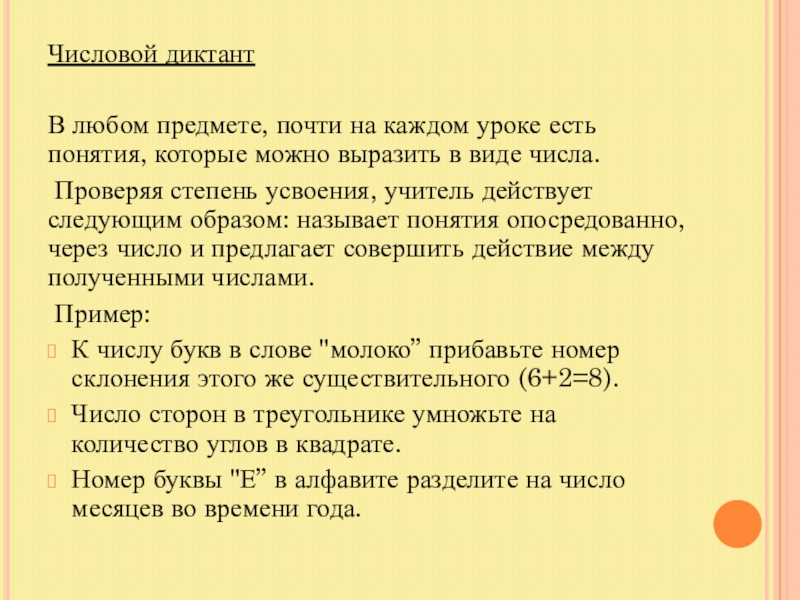 Проверяя степень усвоения, учитель действует следующим образом: называет понятия опосредованно, через число и предлагает совершить действие между полученными числами.