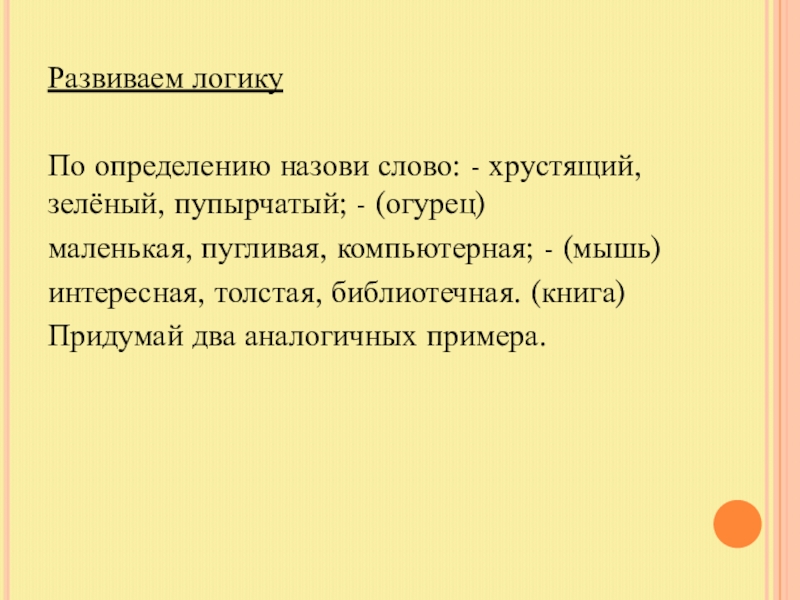 По определению назови слово: - хрустящий, зелёный, пупырчатый; - (огурец)