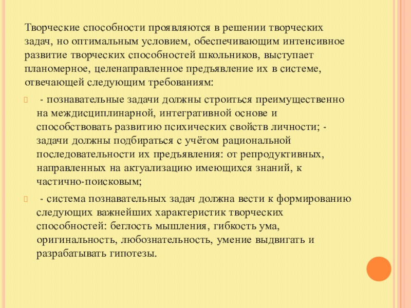 интенсивное развитие творческих способностей школьников, выступает планомерное, целенаправленное предъявление их в системе, отвечающей следующим требованиям: