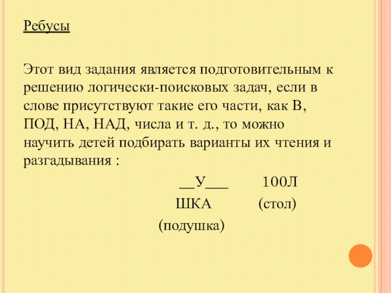 в слове присутствуют такие его части, как В, ПОД, НА, НАД, числа и т. д., то можно научить детей подбирать варианты их чтения и разгадывания :