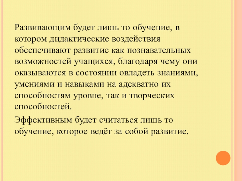 Слайд 3Развивающим будет лишь то обучение, в котором дидактические воздействия обеспечивают развитие