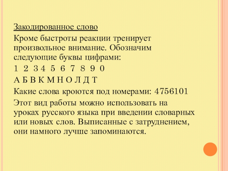 Кроме быстроты реакции тренирует произвольное внимание. Обозначим следующие буквы цифрами: