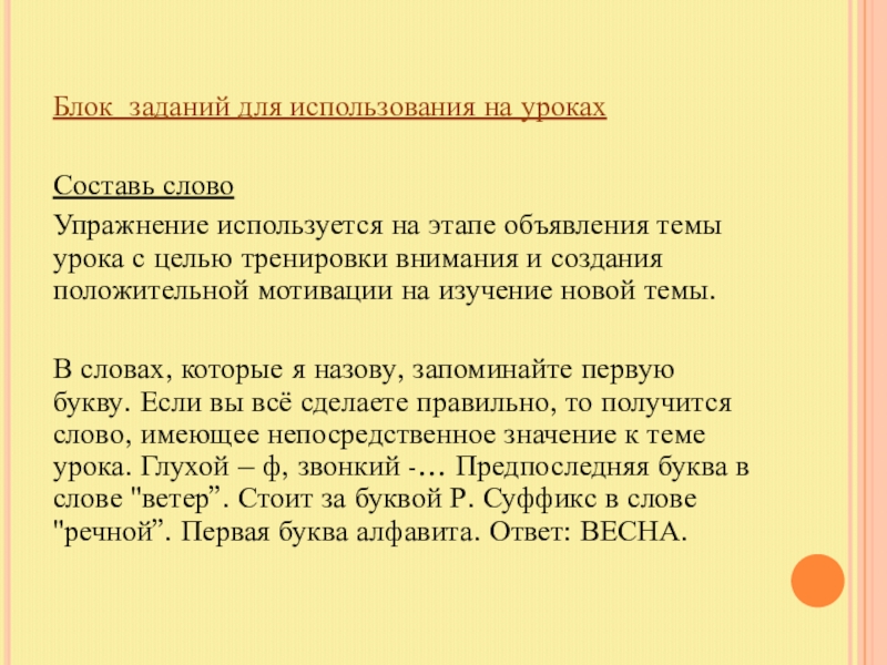 В словах, которые я назову, запоминайте первую букву. Если вы всё сделаете правильно, то получится слово, имеющее непосредственное значение к теме урока. Глухой – ф, звонкий -… Предпоследняя буква в слове "ветер”. Стоит за буквой Р. Суффикс в слове "речной”. Первая буква алфавита. Ответ: ВЕСНА.