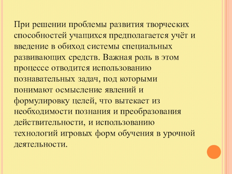 Слайд 5При решении проблемы развития творческих способностей учащихся предполагается учёт и введение