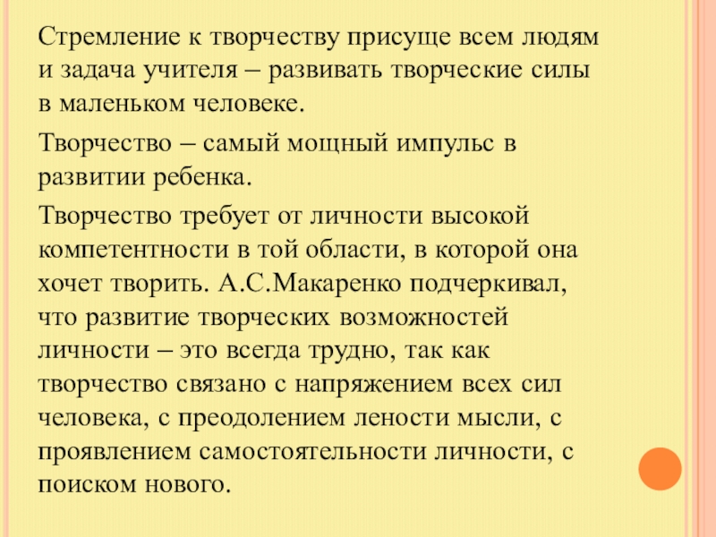 Творчество требует от личности высокой компетентности в той области, в которой она хочет творить. А.С.Макаренко подчеркивал, что развитие творческих возможностей личности – это всегда трудно, так как творчество связано с напряжением всех сил человека, с преодолением лености мысли, с проявлением самостоятельности личности, с поиском нового.