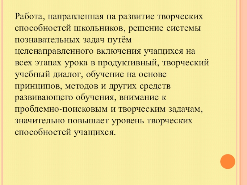 Слайд 18Работа, направленная на развитие творческих способностей школьников, решение системы познавательных задач