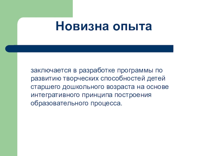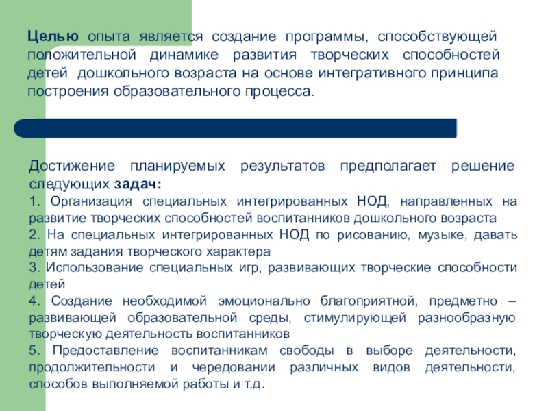 Целью опыта является создание программы, способствующей положительной динамике развития творческих способностей детей дошкольного возраста на основе интегративного принципа построения образовательного процесса.