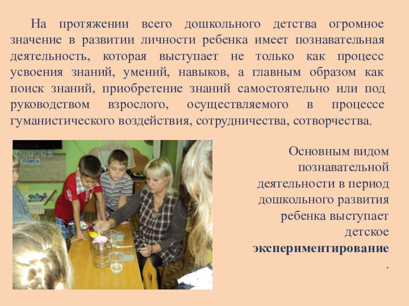 Основным видом познавательной деятельности в период дошкольного развития ребенка выступает детское экспериментирование.