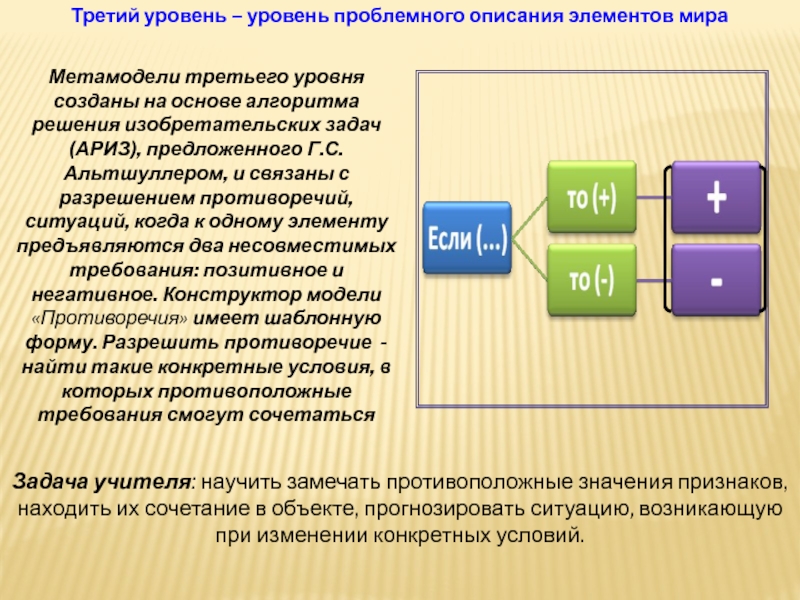 Метамодели третьего уровня созданы на основе алгоритма решения изобретательских задач (АРИЗ), предложенного Г.С. Альтшуллером, и связаны с разрешением противоречий, ситуаций, когда к одному элементу предъявляются два несовместимых требования: позитивное и негативное. Конструктор модели «Противоречия» имеет шаблонную форму. Разрешить противоречие - найти такие конкретные условия, в которых противоположные требования смогут сочетаться