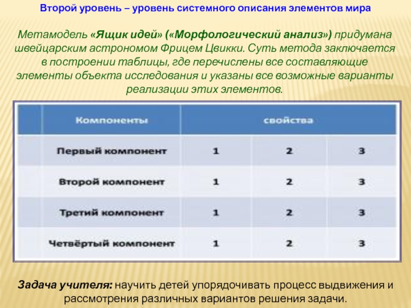 Метамодель «Ящик идей» («Морфологический анализ») придумана швейцарским астрономом Фрицем Цвикки. Суть метода заключается в построении таблицы, где перечислены все составляющие элементы объекта исследования и указаны все возможные варианты реализации этих элементов.