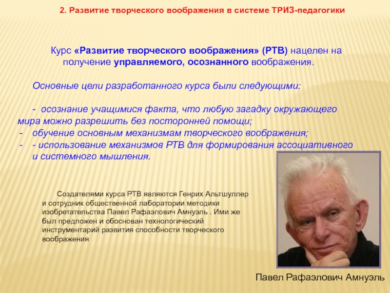 Создателями курса РТВ являются Генрих Альтшуллер и сотрудник общественной лаборатории методики изобретательства Павел Рафаэлович Амнуэль . Ими же был предложен и обоснован технологический инструментарий развития способности творческого воображения