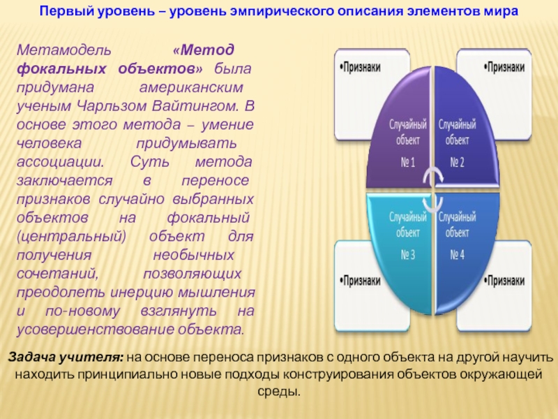 была придумана американским ученым Чарльзом Вайтингом. В основе этого метода – умение человека придумывать ассоциации. Суть метода заключается в переносе признаков случайно выбранных объектов на фокальный (центральный) объект для получения необычных сочетаний, позволяющих преодолеть инерцию мышления и по-новому взглянуть на усовершенствование объекта.