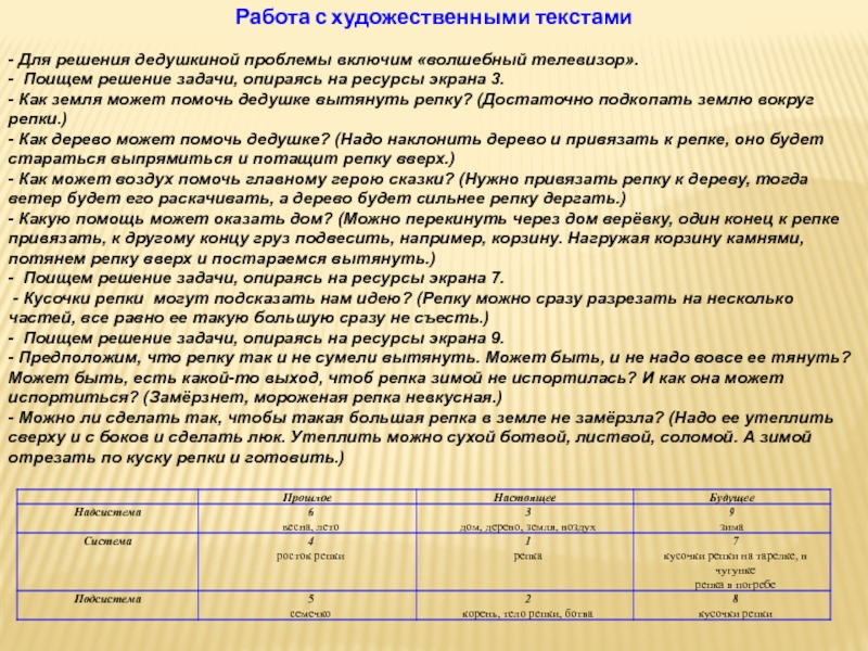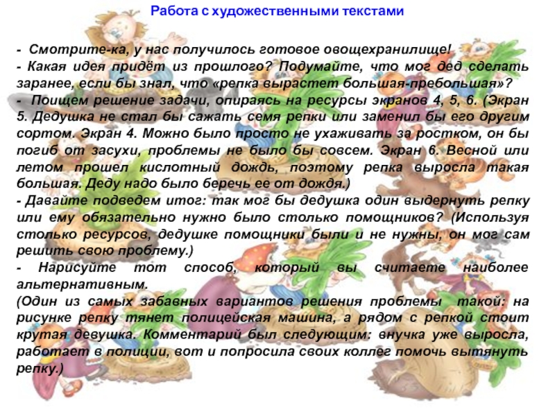 - Поищем решение задачи, опираясь на ресурсы экранов 4, 5, 6. (Экран 5. Дедушка не стал бы сажать семя репки или заменил бы его другим сортом. Экран 4. Можно было просто не ухаживать за ростком, он бы погиб от засухи, проблемы не было бы совсем. Экран 6. Весной или летом прошел кислотный дождь, поэтому репка выросла такая большая. Деду надо было беречь ее от дождя.)