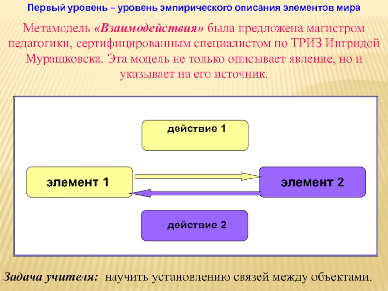 Метамодель «Взаимодействия» была предложена магистром педагогики, сертифицированным специалистом по ТРИЗ Ингридой
