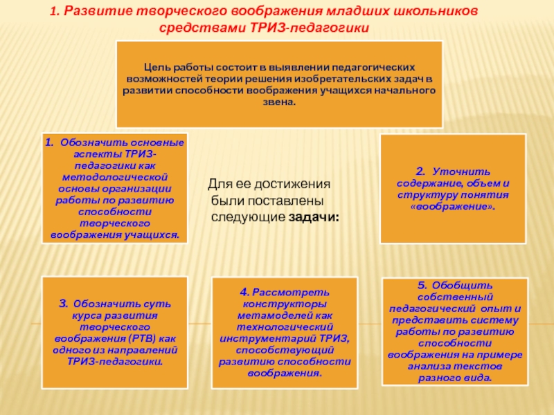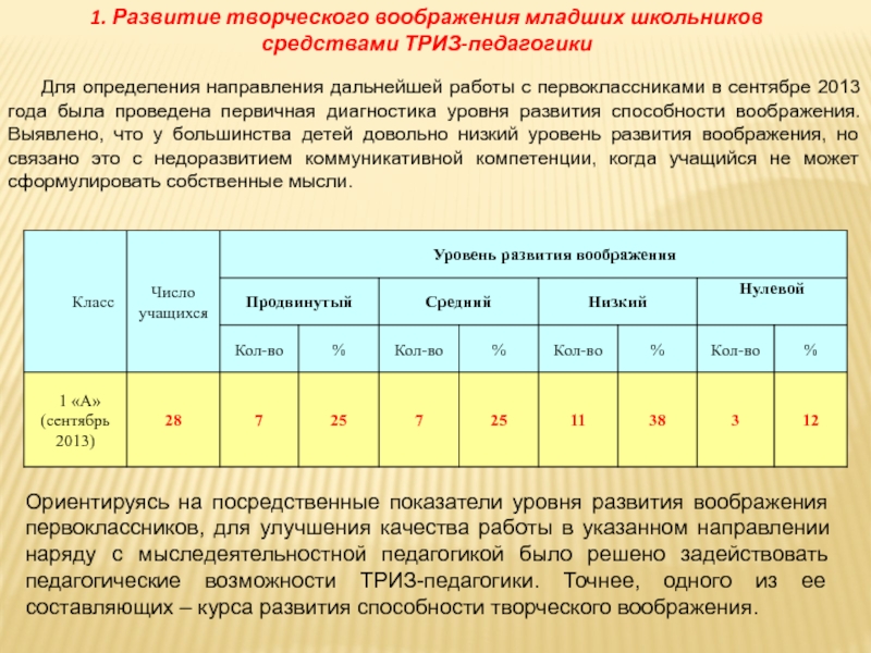 Ориентируясь на посредственные показатели уровня развития воображения первоклассников, для улучшения качества работы в указанном направлении наряду с мыследеятельностной педагогикой было решено задействовать педагогические возможности ТРИЗ-педагогики. Точнее, одного из ее составляющих – курса развития способности творческого воображения.