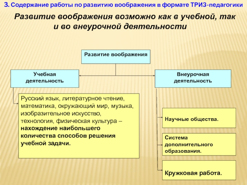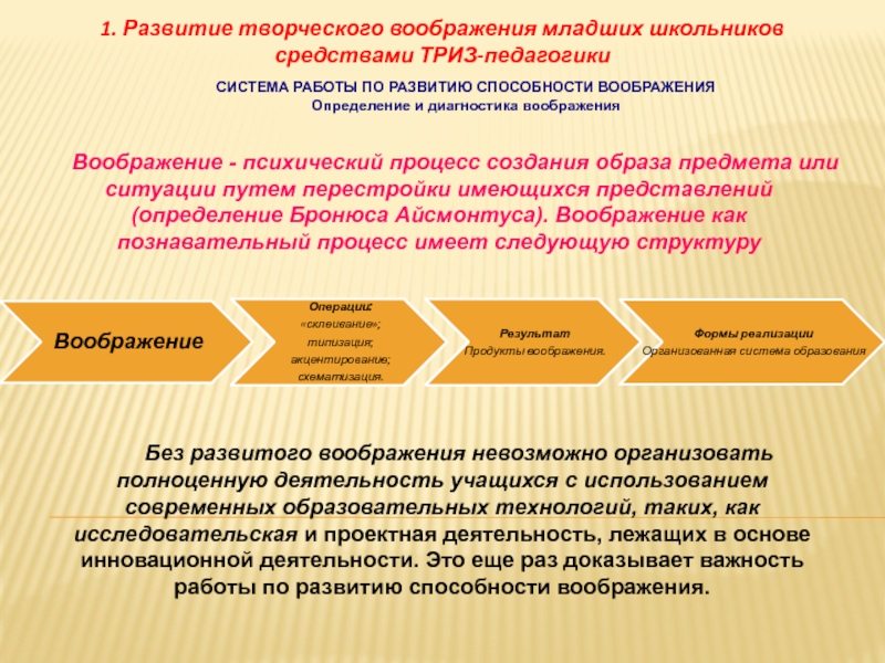 Развитие творческого воображения (РТВ). Современная школа интенсивно формирует человеческий потенциал, развивает способности не только одаренных детей, а всех детей без исключения. ТРИЗ-педагогика уделяет особое внимание развитию способности творческого воображения. Почему важно развивать именно способность воображения? Ответ достаточно прост. Чтобы сделать процесс обучения наиболее успешным для каждого ученика. Развивая воображение, мы будем развивать способности понимания и мышления.