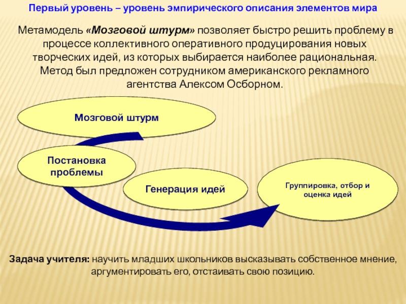 быстро решить проблему в процессе коллективного оперативного продуцирования новых творческих идей, из которых выбирается наиболее рациональная. Метод был предложен сотрудником американского рекламного агентства Алексом Осборном.