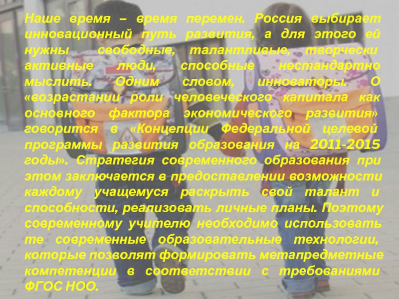 для этого ей нужны свободные, талантливые, творчески активные люди, способные нестандартно мыслить. Одним словом, инноваторы. О «возрастании роли человеческого капитала как основного фактора экономического развития» говорится в «Концепции Федеральной целевой программы развития образования на 2011-2015 годы». Стратегия современного образования при этом заключается в предоставлении возможности каждому учащемуся раскрыть свой талант и способности, реализовать личные планы. Поэтому современному учителю необходимо использовать те современные образовательные технологии, которые позволят формировать метапредметные компетенции в соответствии с требованиями ФГОС НОО.