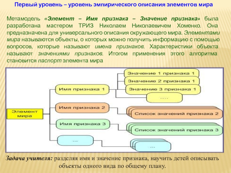 признака – Значение признака» была разработана мастером ТРИЗ Николаем Николаевичем Хоменко. Она предназначена для универсального описания окружающего мира. Элементами мира называются объекты, о которых можно получить информацию с помощью вопросов, которые называют имена признаков. Характеристики объекта называют значениями признаков. Итогом применения этого алгоритма становится паспорт элемента мира