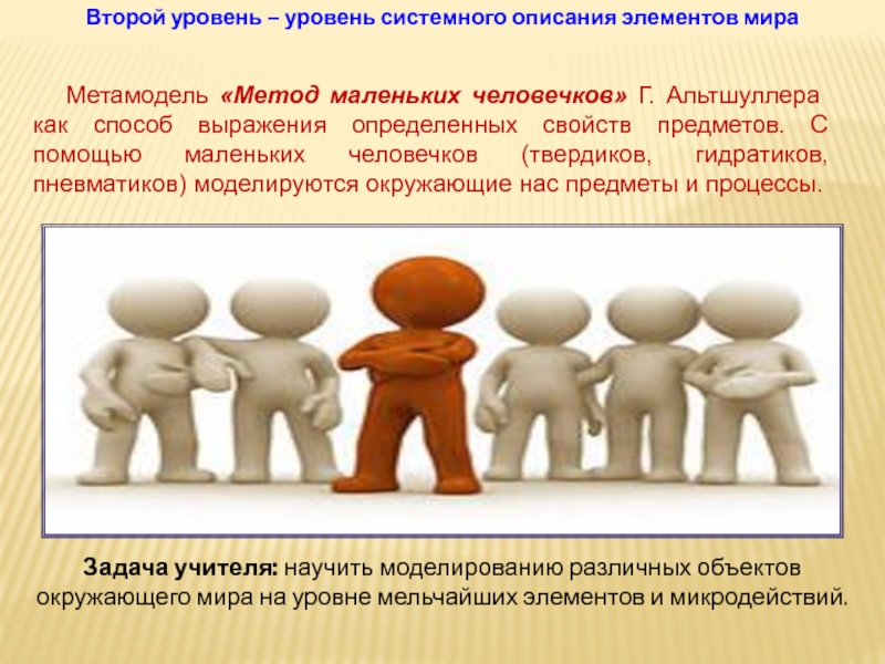 Метамодель «Метод маленьких человечков» Г. Альтшуллера как способ выражения определенных свойств предметов. С помощью маленьких человечков (твердиков, гидратиков, пневматиков) моделируются окружающие нас предметы и процессы.