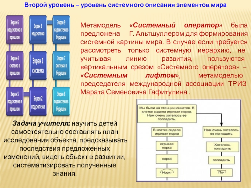 Метамодель «Системный оператор» была предложена Г. Альтшуллером для формирования системной картины мира. В случае если требуется рассмотреть только системную иерархию, не учитывая линию развития, пользуются вертикальным срезом «Системного оператора» – «Системным лифтом», метамоделью председателя международной ассоциации ТРИЗ Марата Семеновича Гафитулина .