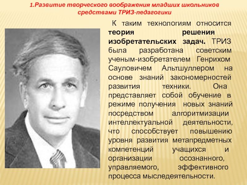 разработана советским ученым-изобретателем Генрихом Сауловичем Альтшуллером на основе знаний закономерностей развития техники. Она представляет собой обучение в режиме получения новых знаний посредством алгоритмизации интеллектуальной деятельности, что способствует повышению уровня развития метапредметных компетенций учащихся и организации осознанного, управляемого, эффективного процесса мыследеятельности.