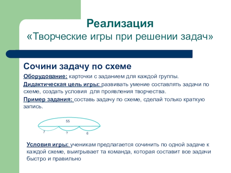 Условия игры: ученикам предлагается сочинить по одной задаче к каждой схеме, выигрывает та команда, которая составит все задачи быстро и правильно