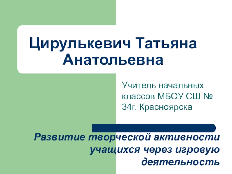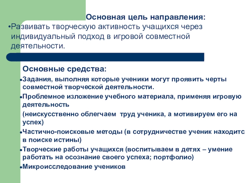 Развивать творческую активность учащихся через индивидуальный подход в игровой совместной деятельности.