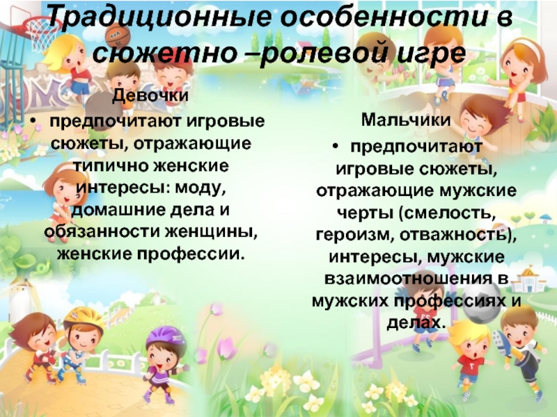 предпочитают игровые сюжеты, отражающие мужские черты (смелость, героизм, отважность), интересы, мужские взаимоотношения в мужских профессиях и делах.